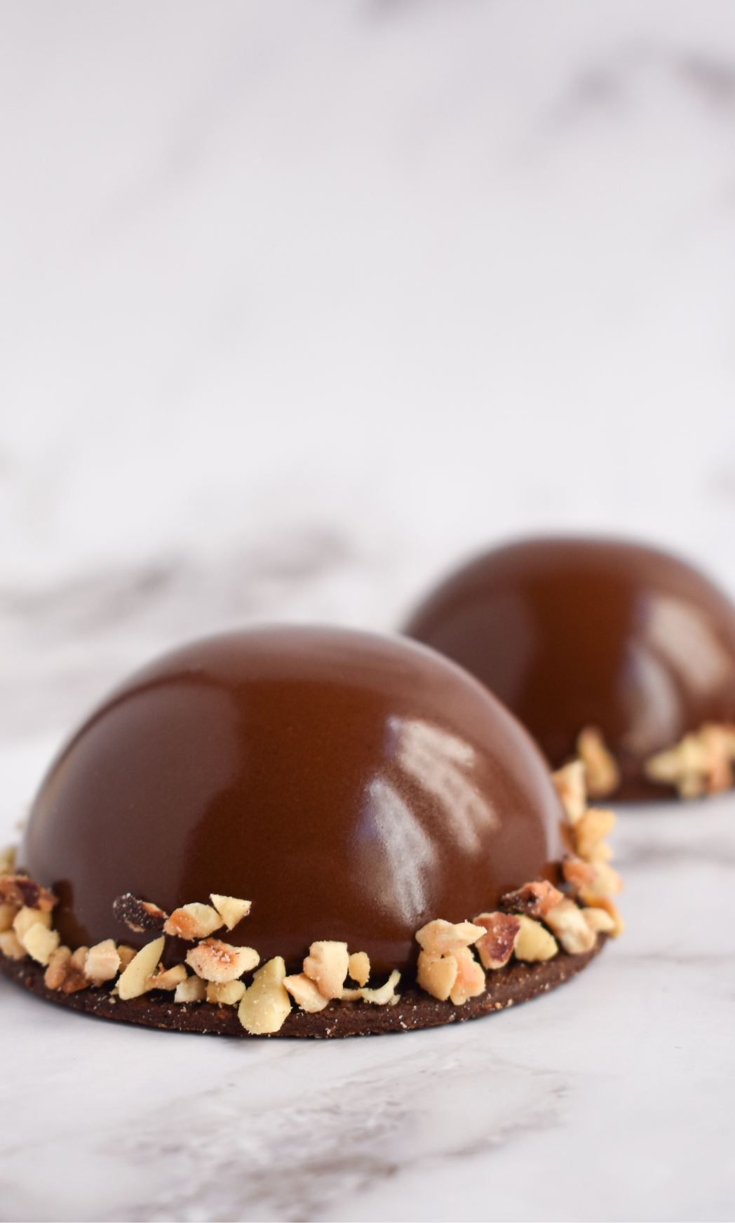 - Entremets 2 choco : sablé cacao, insert chocolat au lait, mousse chocolat noir, glaçage miroir chocolat